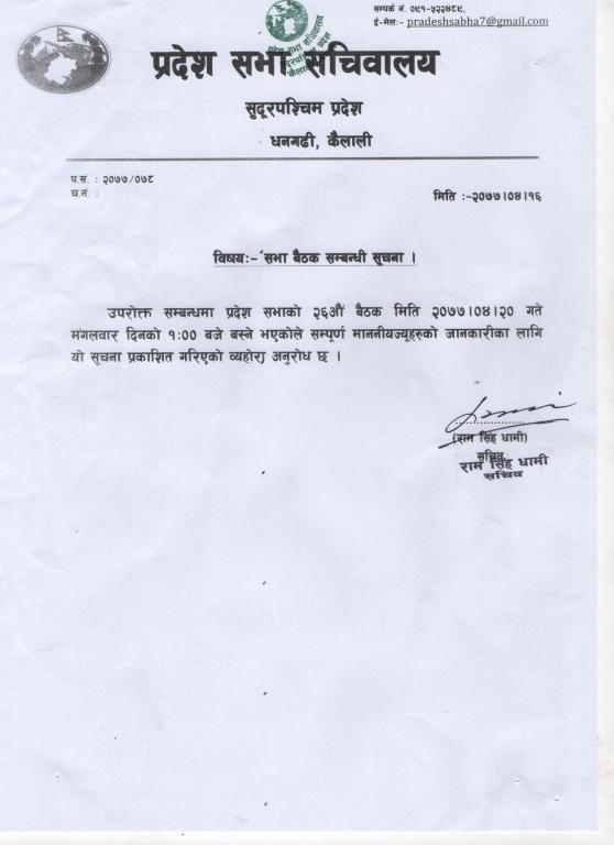प्रदेश सभा वैठक सम्बन्धी सूचना