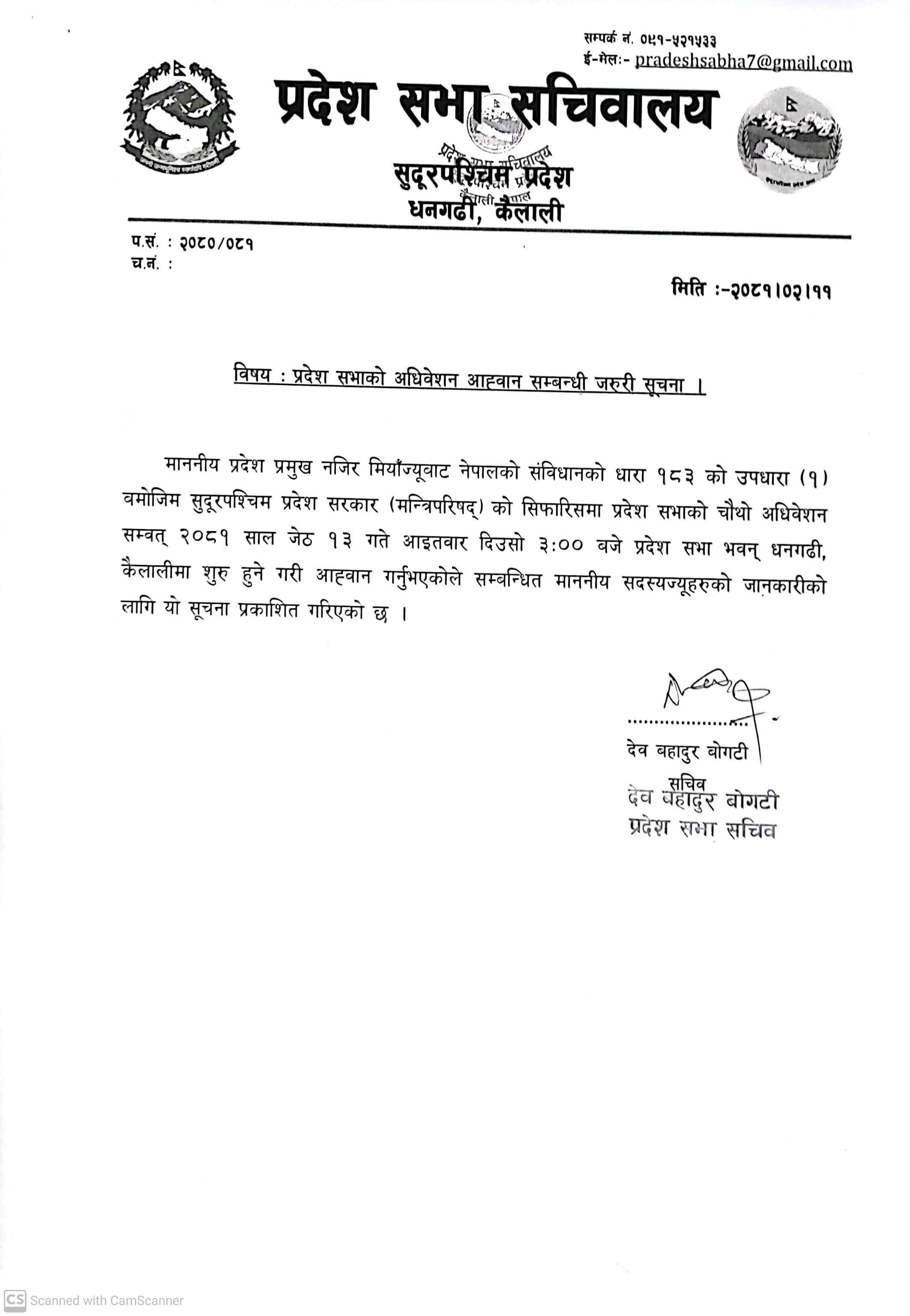 सुदूरपश्‍चिम प्रदेश सभाको चौथो अधिवेशन आव्‍हान सम्बन्धी सूचना