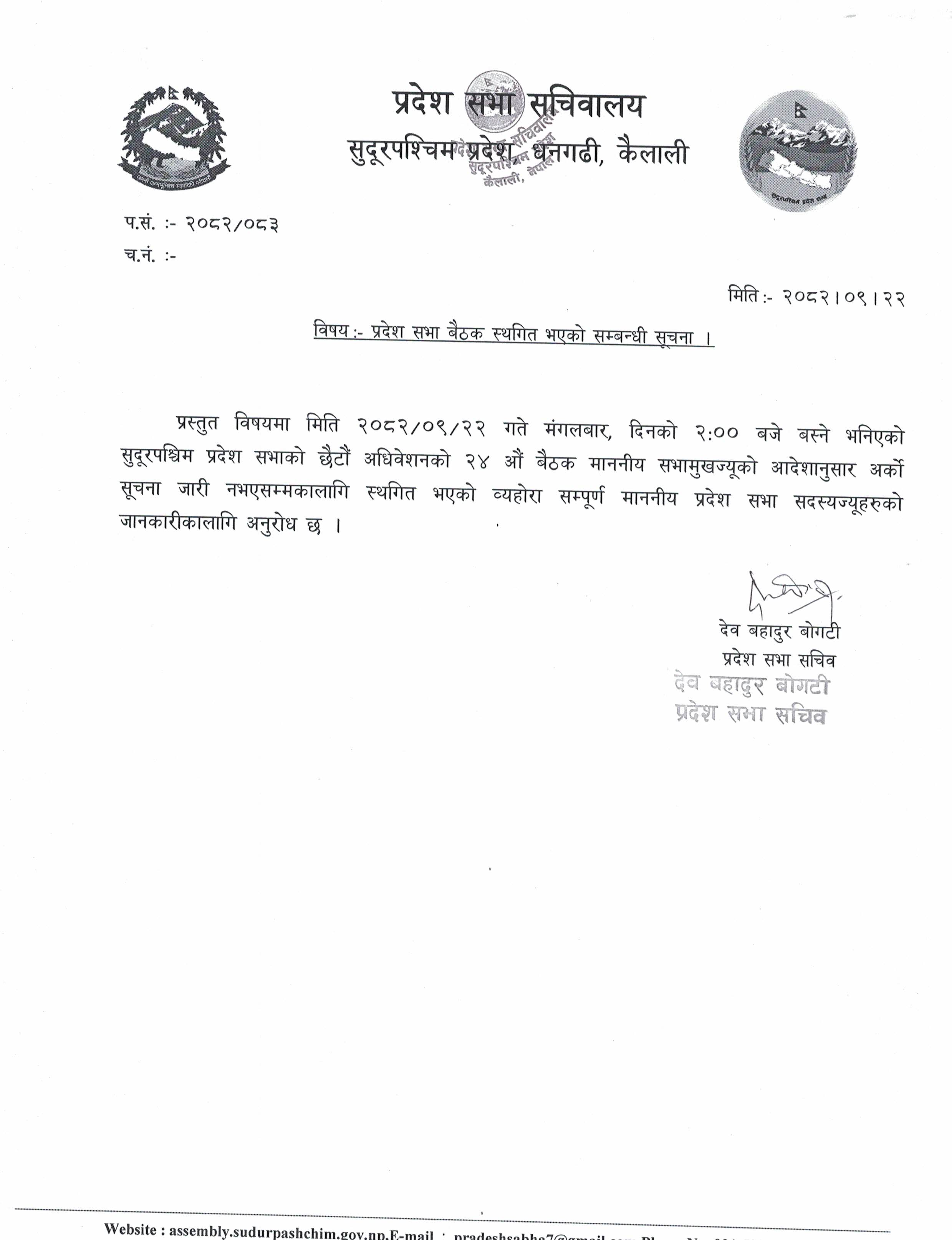 २४औ प्रदेश सभा बैठक स्थगित भएको सुचना